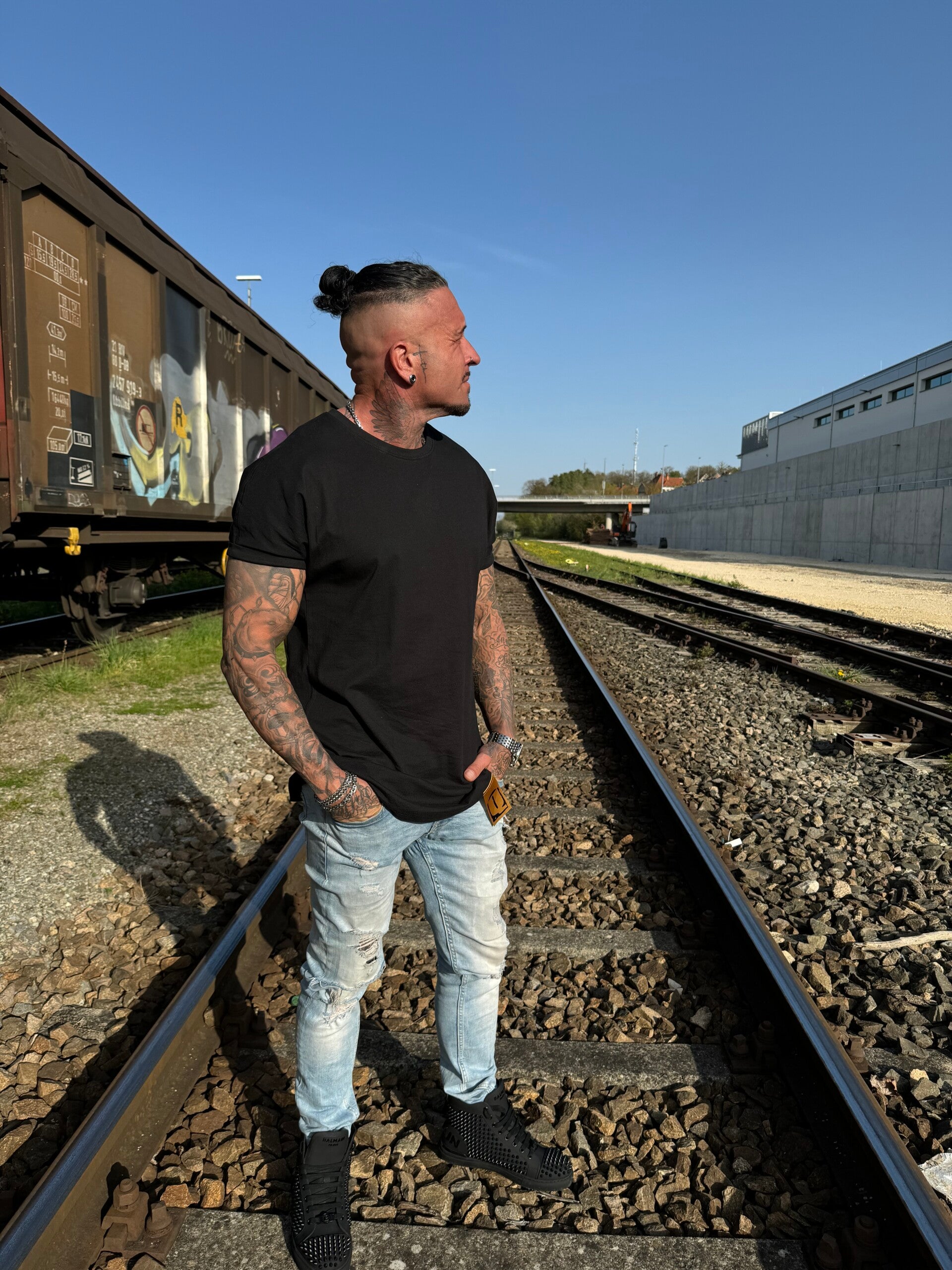 Das Shirt besteht zu 100% aus Baumwolle und hat wirklich einen sehr tollen Schnitt. Über die Schultern und an den Armen betont es den Körper und wirkt sehr sportlich. Die Ärmel sind zweifach umgeschlagen und vernäht. Insgesamt ist es an ein Oversize Shirt angelehnt allerdings ist es an der Taille etwas betont ohne zu eng anzuliegen. Somit fällt es sehr legere. Am Bund ist es leicht rund geschnitten und mit dem Black Q Logo veredelt. Insgesamt ist das Shirt länger als normal. Aber insbesondere nach der ersten Waschung ( 30 Grad ) geht es in der Länge noch ganz leicht ein.