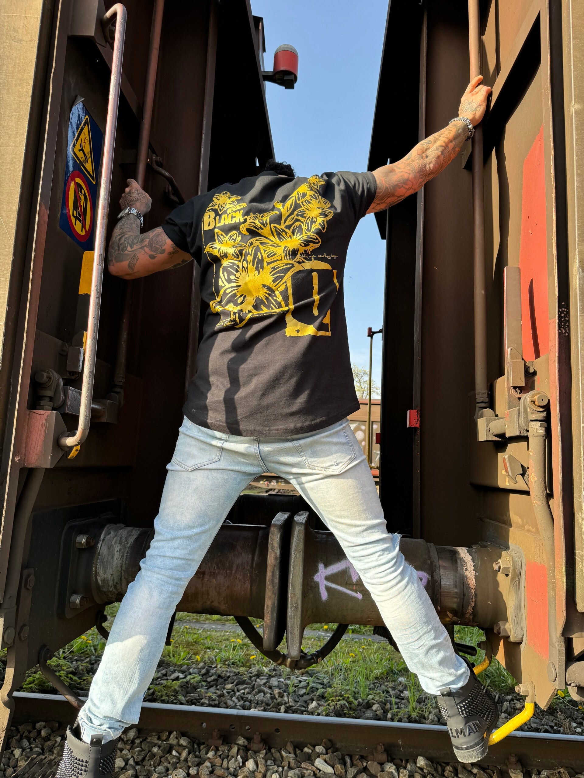 Mit der Erstauflage von BLACK Q Brand mit dem Motiv "lets make something happen“ wird das Herzens- Projekt "Tattoo mit Herz“ aufgegriffen welches unter dem Motto lebt "lass uns was bewegen/lets make something happen".In farbintensiver und kontrastreicher Shirt und Motiv-Farb Kombination stellt der Druck mehrere aufblühende Lilien in Vereinigung mit dem BLACK Q Logo dar. Lilien stehen sinnbildlich unter anderem für Schönheit,Reinheit und Liebe. Also symbolisieren diese das Credo welches Black Q mit dem Projekt "Tattoo mit Herz“ verfolgt.